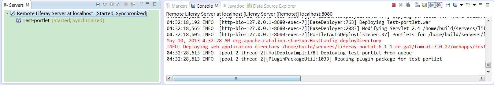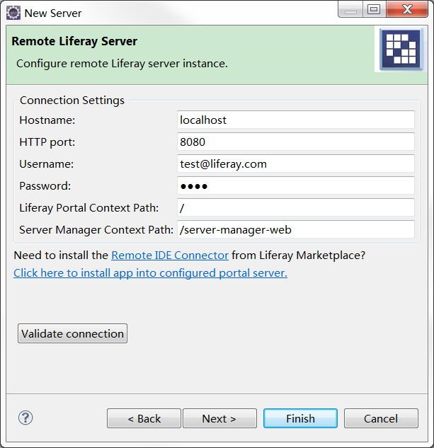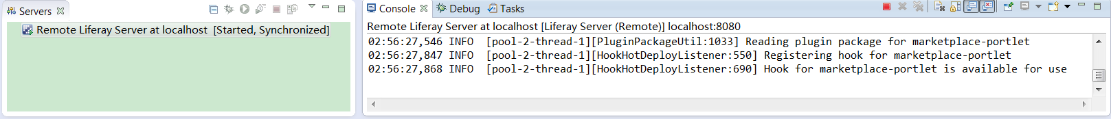 21. Once you select Finish, the new Remote Server will be available in the Servers view and Eclipse will connect to the remote server by the proxy which you've already configured. Then the remote liferay logs will be displayed in Eclipse's console. If your remote server is in debug mode, the Eclipse java debugger will be attached to the remote process automatically.