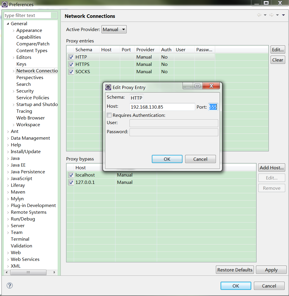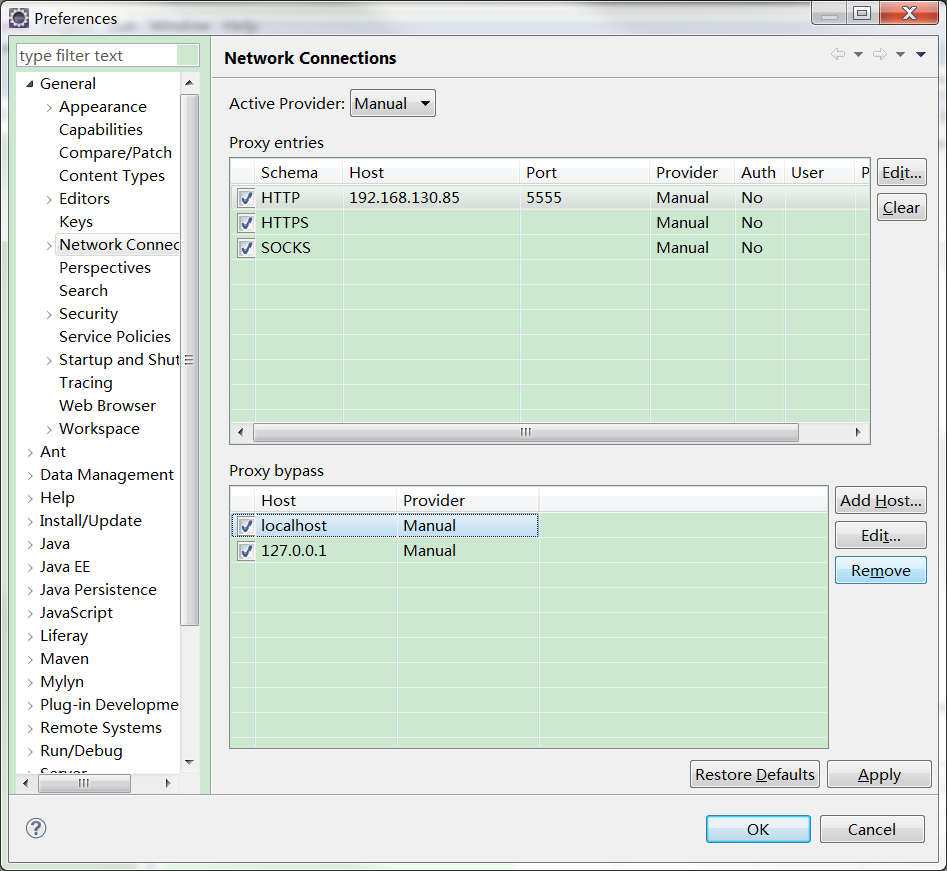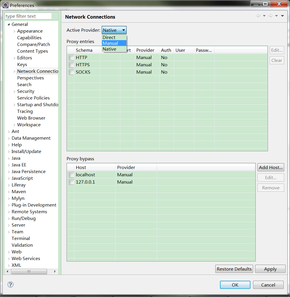 3. In Eclipse bundled with Liferay IDE 2.0.x plugins installed, go to Windows > preferences > General > Network Connections, then in the Active Provider check box, choose Manual.