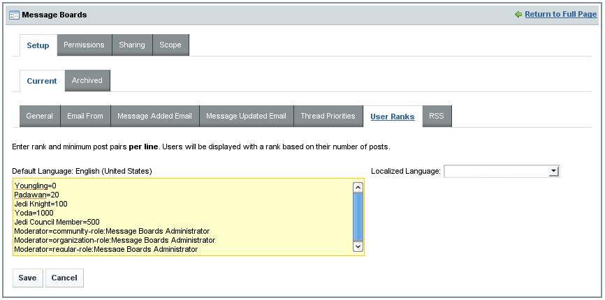 Users can be granted different ranks depending on the number of messages they have posted. By default, you have liferay rankings, but these can be changed in the configuration view. You just need to set your own ranks and the number of messages required.