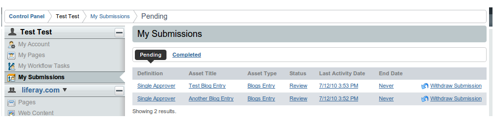 There are three views in this portlet, "Pending", "Completed" and the detailed view of each submission