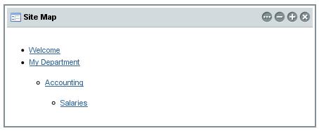 Displays a structured directory of links to all pages in the portal. The Site Map can be used to navigate directly to any page on the site. It can be configured to display the entire site or a sub-section of pages.